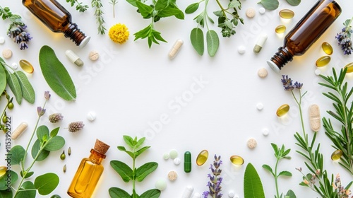 The image shows an assortment of natural elements and capsules arranged around the edges of a pink background
