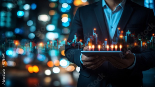 The image shows an Stock man with a forex chart in a blurred city background.