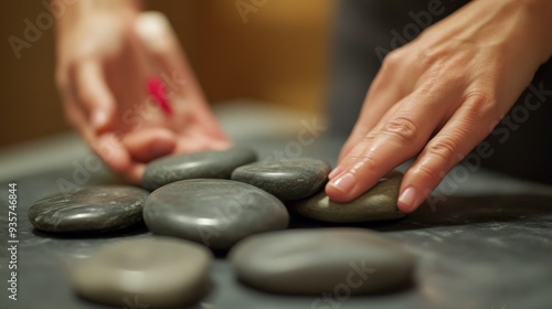 The image shows hands placing massage stones, highlighting the deliberate and careful technique used in therapeutic massage preparations aimed at healing and relaxation.