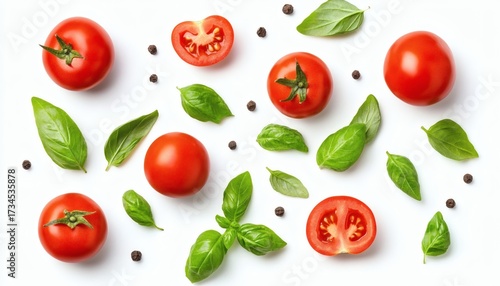 The image shows several whole and halved red tomatoes arranged with fresh green basil leaves and peppercorns on a white background.