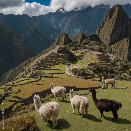 The Inca Trail winding through the Andes, with llamas grazing nearby.