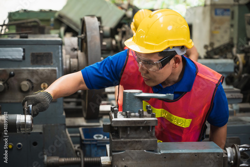 The industrial worker team is working on various projects in a large industrial factory with many equipment.