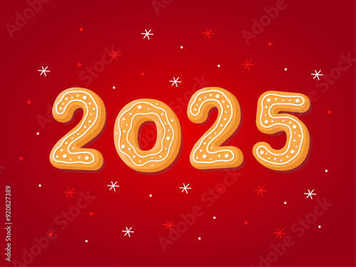 The inscription "2025" on a red background. New Year's gingerbread cookies in the form of letters. Homemade Christmas cookies with sweet sugar icing. Christmas card, flyer, banner, poster.