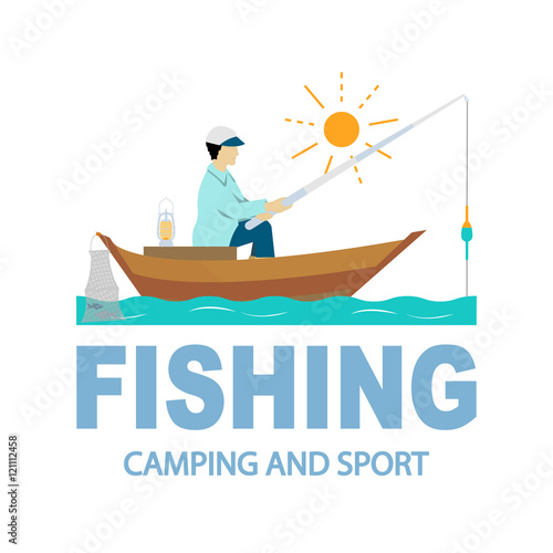 The inscription fishing camping and sport. Fishing rod, fishing reel, hooks.Icons and illustrations for design, website, infographic, poster, advertising. Fat style.