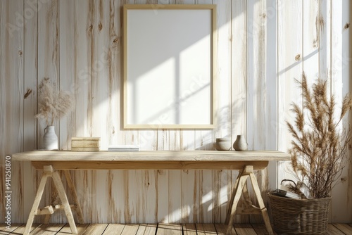 The interior of a stylish home office room with a desk and pouf. This is a mockup frame of the interior.