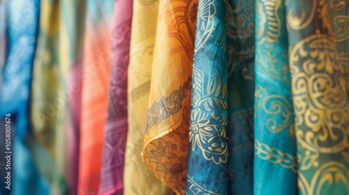 The intricate designs and patterns of a handdyed silk scarf delicately hung on a clothesline to dry.