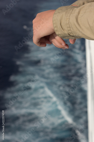 The joined hands of a traveler stand over the foamy waters on the deck of a ship