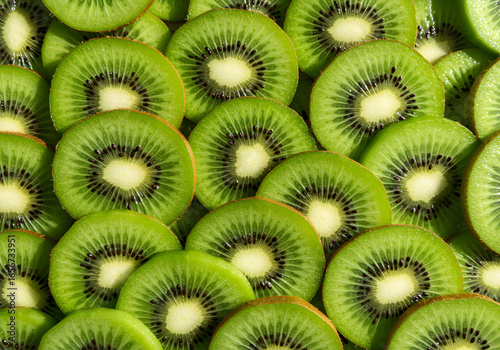 The kiwi fruit slices are stacked and fill the entire frame. Suitable for a food or fruit background. Vibrant color.