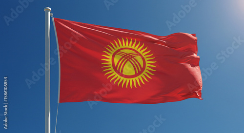 The Kyrgyz flag fluttering steadily in the soft morning breeze, with a cloudless sky as the backdrop.