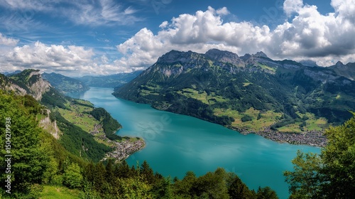 The lake scenery is green, the mountains are blue and cloudy, and the blue sky is white clouds. The poster art style and details capture the bird's-eye view and natural beauty of the ground.