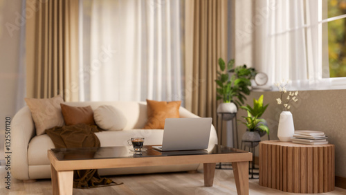 The laptop and coffee cup place on square wooden table in front of leather sofa. Earth tone interior