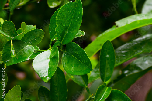 The leaves of the lemon tree, Drops of water on a lemon leaf, Raindrops flowing in the rain