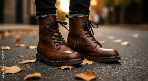 The legs of a person in black jeans and brown leather lace-up boots. The man stands on an asphalt road strewn with fallen yellow leaves.