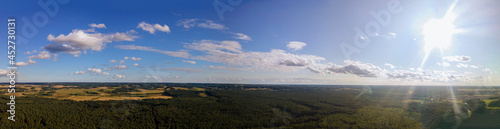 The light of the sun shining through the clouds in the sky. Amazing of fluffy clouds moving softly on the sky and the sun shining through the clouds with beautiful rays and lens flare. Space for text.