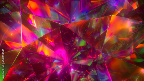 The light passes through the facets of a slowly rotating diamond and creates repetitive sparkling highlights and bright rainbow colors. Rainbow dispersion of light. 3d illustration