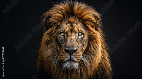 The Lion King stands majestically against a dramatic black backdrop, its golden mane radiating regal power. This captivating image encapsulates the essence of the iconic and powerful lion.