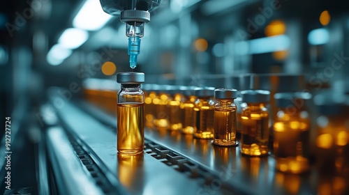The liquid medicine inside a vial is captured with a syringe inserted into it.