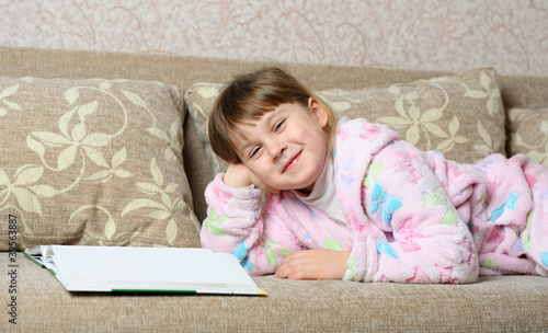 The little girl reads the book lying on a sofa
