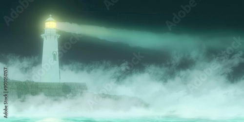 The Lonely Lighthouse: A forlorn lighthouse, its beacon barely visible through dense fog