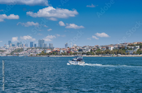 The luxury yacht is sailing along the Bosphorus. uskudar, Istanbul, Turkey.