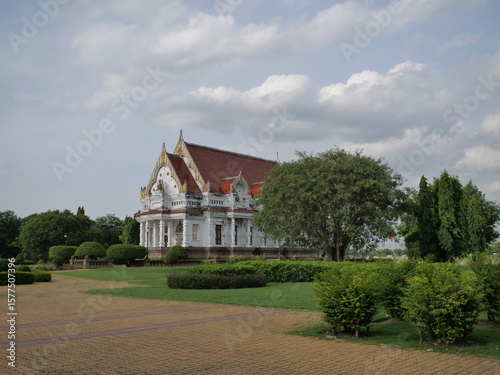 The magnificent Buddha Image Hall at Phutthamonthon, with its striking white and gold architecture, surrounded by manicured gardens. Symbolizes Thai Buddhism and spiritual grandeur.