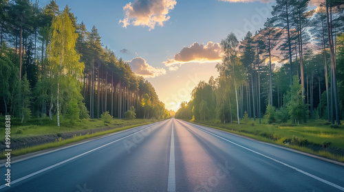 The main asphalt road that stretches towards the horizon, surrounded by green forest, in the glow of the setting sun.