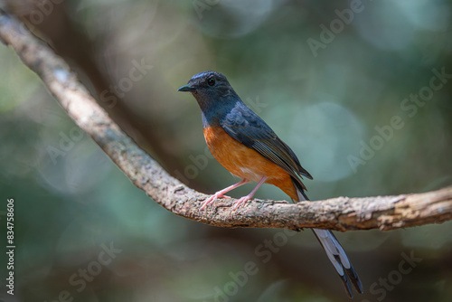 The male White-rumped Shama (Copsychus malabaricus) has a bright blue-black head and prominent white upperparts, a rump and a long blackish tail.