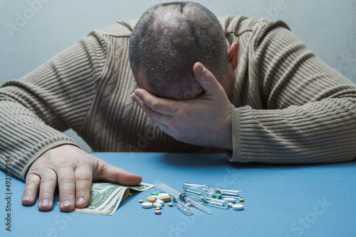 The man hides his face with one hand, holds money in the other, and medical preparations are in front of him.