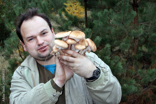 The man holds in his hands a lot of mushrooms, known as a honey fungus
