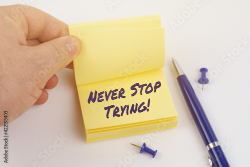 The man is leafing through the stickers, the sheet says - Never Stop Trying