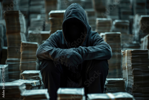 The man is wearing mysterious clothing with a stack of money.