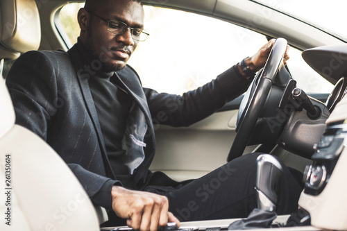 The man presses the buttons in the car. Adjustment of audio volume control.