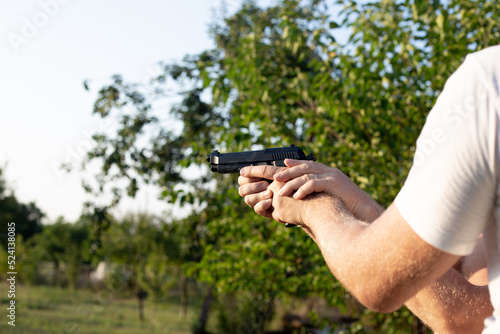 The man supports the hands of another man in which the gun. Pistol shooting training. Recreation and hobby