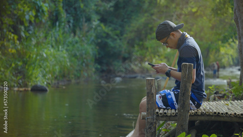 the man using laptop for working while outdoor camping