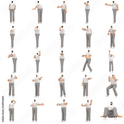 The man with beard wearinggray corduroy pants and white collar t-shirt is expression of body or doing exercise. 3d rendering of cartoon character in acting.