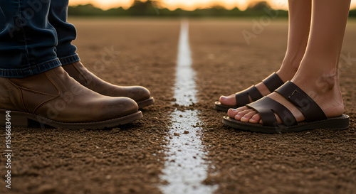 The man with shoes and the woman with slippers are looking at each other, there is a line between them
