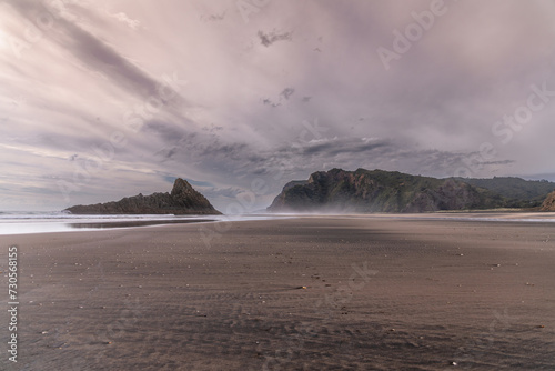 The massive black iron sand Karekare beach with picturesque rock formations out in the water. Waitakere Ranges Regional Park, Auckland, New Zealand.