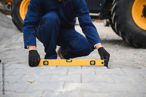 The master in gloves lays paving stones in layers. Laying gray concrete paving slabs in house courtyard on sand foundation base