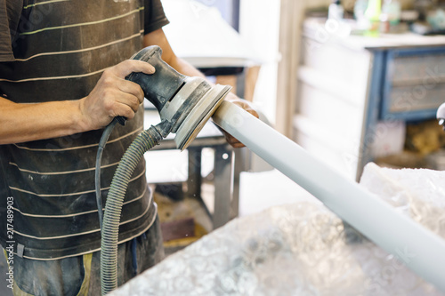 The mechanic works with a grinding machine. Garage painting service. Repairing car section after the accident.