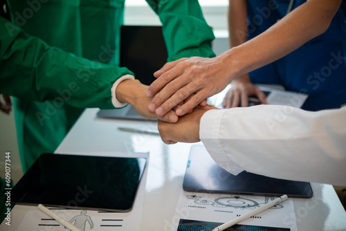 The medical team joins hands after the meeting and discusses the treatment of severely ill patients and can come to a conclusion on the surgical treatment of the patient. Medical team meeting concept