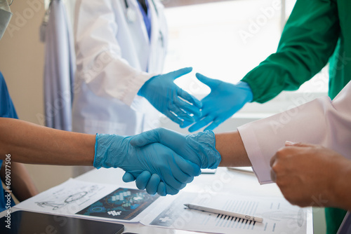 The medical team joins hands after the meeting and discusses the treatment of severely ill patients and can come to a conclusion on the surgical treatment of the patient. Medical team meeting concept