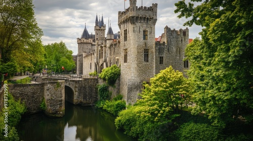 The medieval castle of Gravensteen in Ghent, surrounded by a moat and lush greenery.