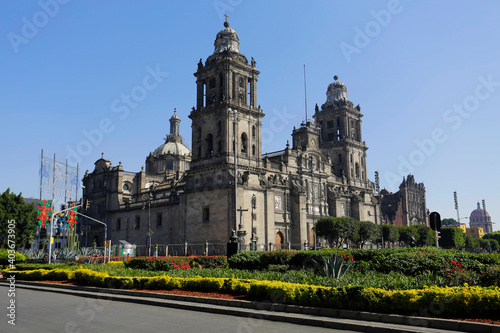 The Metropolitan Cathedral is seen during a blue sky sunny day in downtown Mexico City, DF, Mexico.