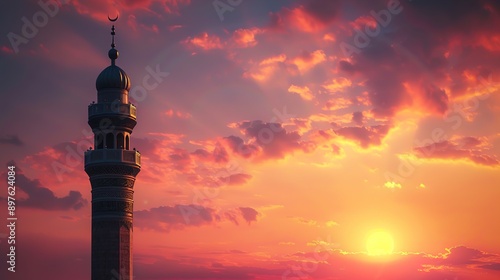 The minaret of a mosque rising against the backdrop of a vibrant sunset.