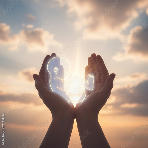 The miracle of life, a transparent silhouette of a baby in tender hands against a cloudy sunny sky