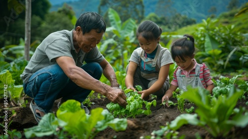 The modern family working together in the vegetable garden. Stock artificial intelligence.