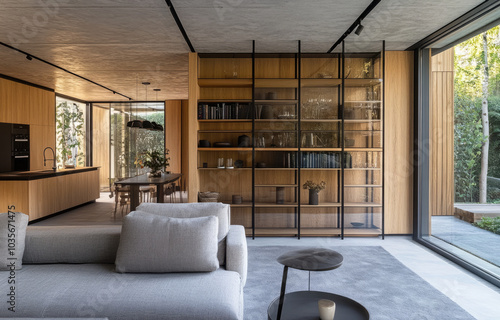 The modern interior of the apartment features an open-plan layout with a kitchen, living room, and hallway.
