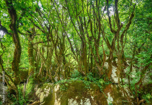 The moss-covered branches of trees after the rain in the forest. High humidity. Nature background