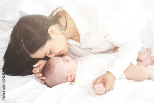 The mother kissed her child while she,he was sleeping. Mother's love for children.