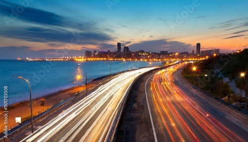 The motion blur of a bustling urban highway during evening rush hour captures the vibrant city energy, with glowing car lights streaking against a stunning skyline backdrop in the fading